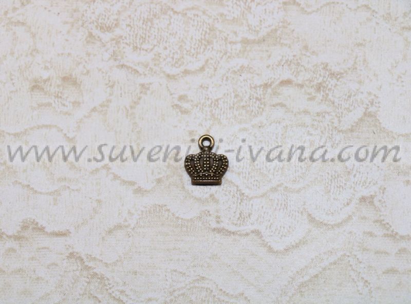 Метален елемент за бижута корона с размери 10 х 11 мм. Цвят старо злато. Металната корона е подходяща при изработка на колиета, гривни, гердани и различни видове бижута и арт проекти.