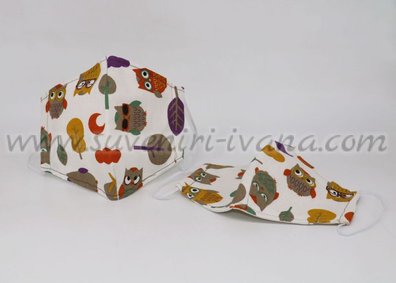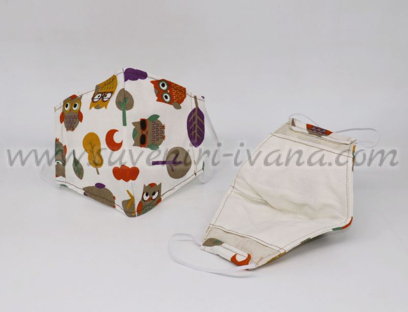 Трипластова защитна маска за лице на бухалчета, за многократна употреба. Маските са изработени от плътен памучен плат, като между вътрешния и средния пласт има празно пространство/джобче. Джобът дава възможност за поставяне на допълнителен филтър за още по-голяма сигурност и филтрация. Маските се прикрепят към главата посредством ластици, които могат да се регулират. Тези маски не са медицински продукт и се препоръчва да се изперат преди първа и след всяка употреба. Желателно е прането им да става на температура не по-висока от 40 градуса. Гладенето не е задължително, но е препоръчително. Размери 20,0 х 13,0 см. и 20,0 х 14,0 см.