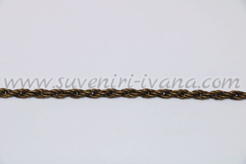 Метален синджир за бижута с плетка от преплетени халки. Синджира е с цвят старо злато и е подходящ за изработка на колиета, гривни, гердани и други видове бижута. Цената е за един метър.