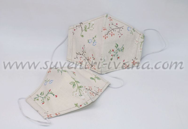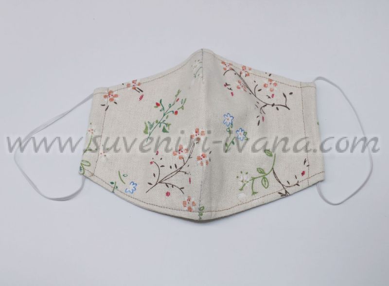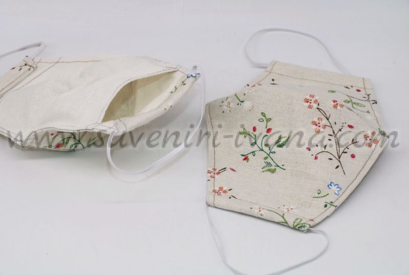 Трипластова защитна маска за лице на цветя, за многократна употреба. Маските са изработени от плътен памучен плат, като между вътрешния и средния пласт има празно пространство/джобче. Джобът дава възможност за поставяне на допълнителен филтър за още по-голяма сигурност и филтрация. Маските се прикрепят към главата посредством ластици, които могат да се регулират. Тези маски не са медицински продукт и се препоръчва да се изперат преди първа и след всяка употреба. Желателно е прането им да става на температура не по-висока от 40 градуса. Гладенето не е задължително, но е препоръчително. Размери 20,0 х 13,0 см. и 20,0 х 14,0 см.