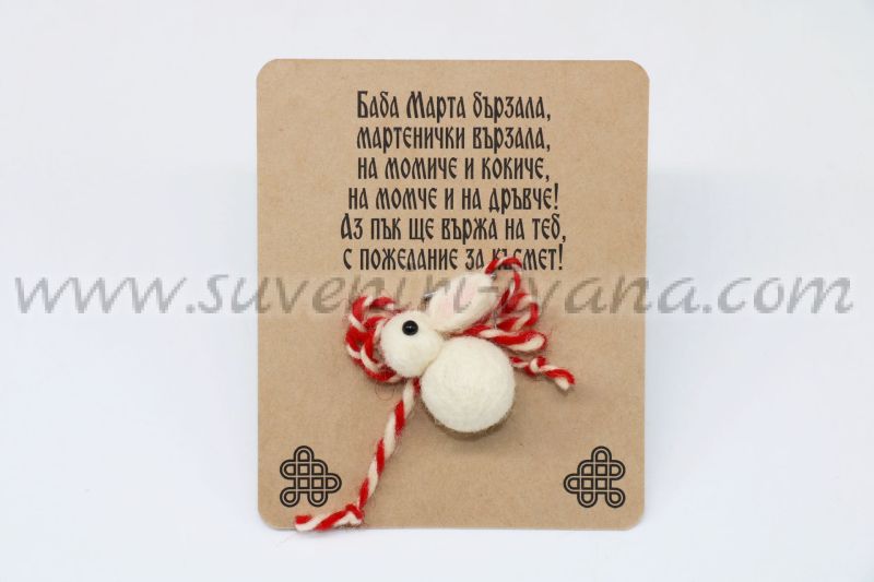 Мартеничка зайче, подходяща за закачане с безопасна игла, направена от вълнена прежда и филц. Мартеницата се предлага с картонче от крафт картон, на което от предната страна има стихче за Баба Марта, а от задната кратка легенда за мартеницата. Модел две.