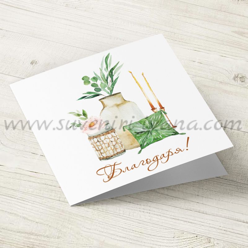 Ръчно изработена картичка за благодарност с надпис 'Благодаря', модел едно. Картичката е с акварелна илюстрация върху еко картон с ленени влакна. Размери 10,0 х 9,6 см. Подходяща е за изказване на благодарност към някого.