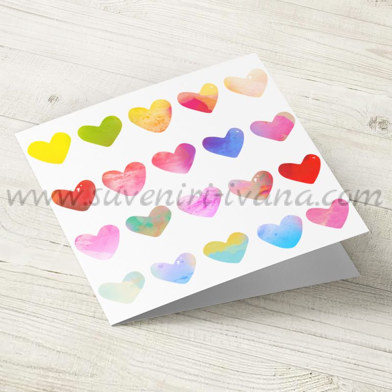 Ръчно изработена поздравителна картичка на цветни сърца. Размери 10,0 х 9,6 см. Подходяща е за Свети Валентин и други различни поводи.