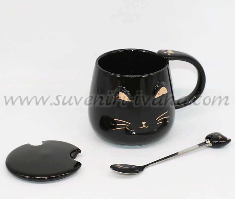 Черна чаша със златен принт котешка муцунка, черно капаче и лъжичка за разбъркване. Чашата е подходяща за чай, кафе или други напитки.