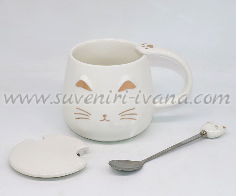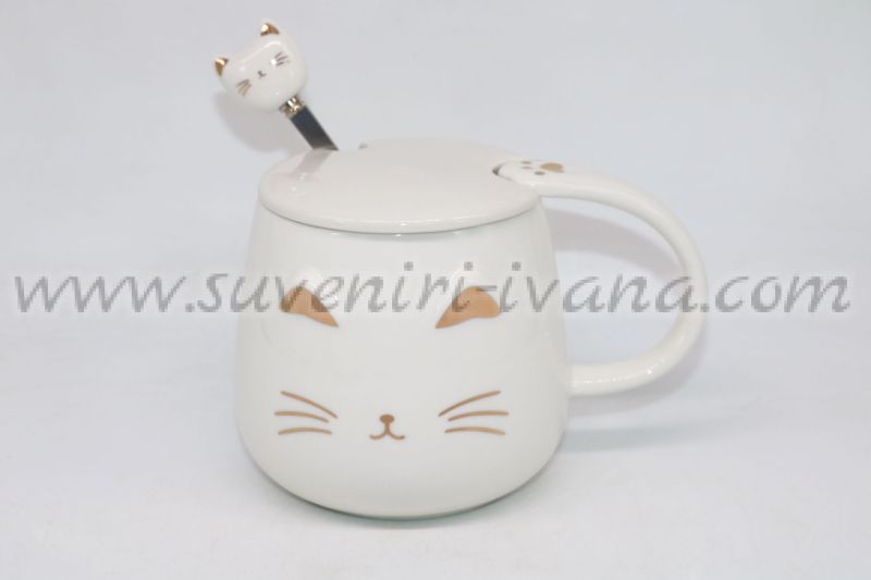 Бяла чаша със златен принт котешка муцунка, бяло капаче и лъжичка за разбъркване. Чашата е подходяща за чай, кафе или други напитки.