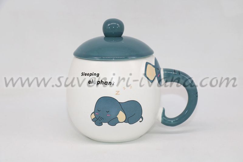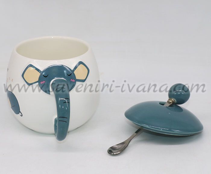 Бяла керамична чаша с картинка спящо слонче, керамично капаче и метална лъжичка за разбъркване. Чашата е подходяща за пиене на чай, кафе или други напитки.