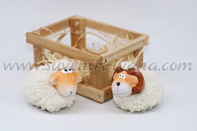 Комплект керамични фигурки овен и овца в дървена кошарка с декорация рафия. Фигурките са покрити с бяла мека вълна. Подходящи са за декорация на дома, работното място или за подарък.