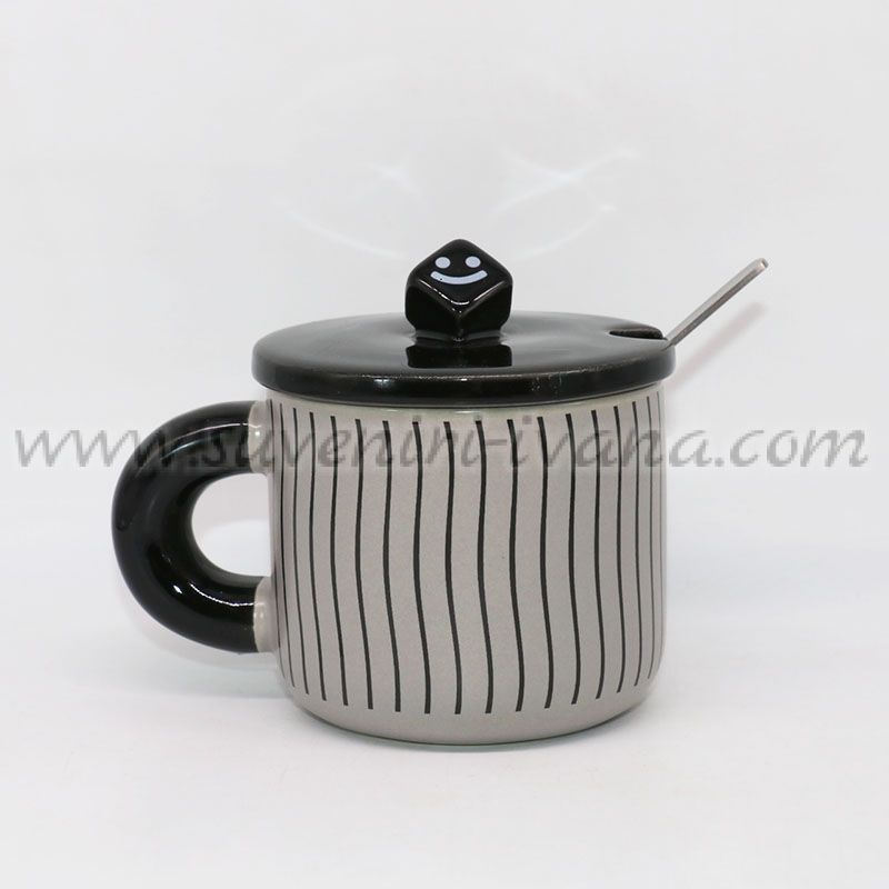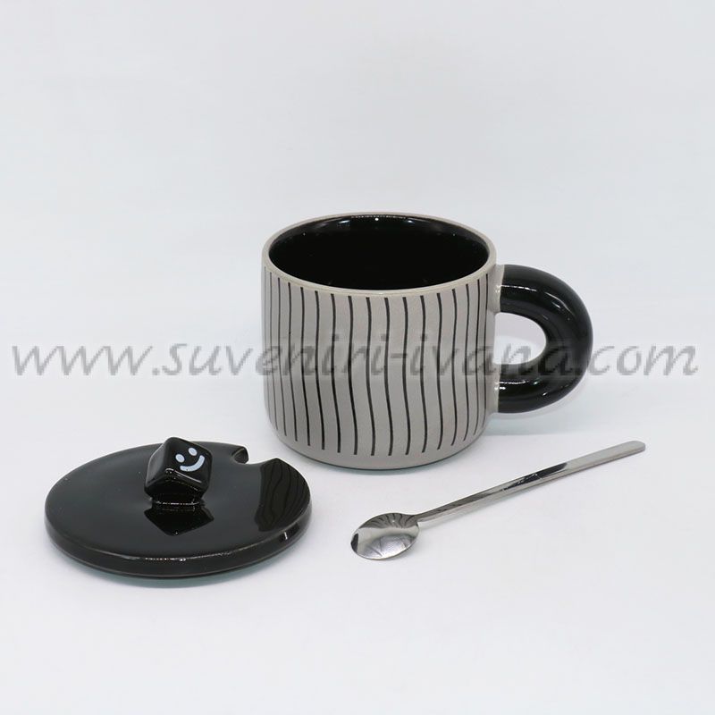 Комплект чаша за чай или кафе в сиво и черно, метална лъжичка за разбъркване от неръждаема стомана и капаче, върху което има зарче с усмивка. Модел четири.