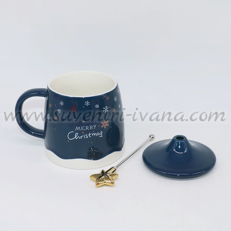 Тъмносиня коледна чаша с красив цветен коледен принт, капаче и метална бъркалка, на върха на която има звезда.