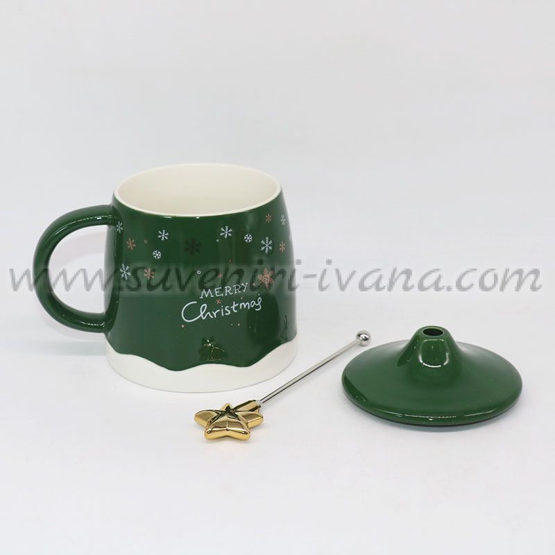 Тъмнозелена коледна чаша с красив цветен коледен принт, капаче и метална бъркалка, на върха на която има звезда.