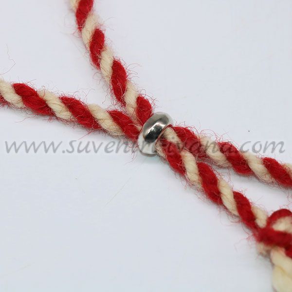 Мартеничка за връзване на ръка направена от бяла и червена вълнена прежда с метално мънисто пръстен за пристягане.