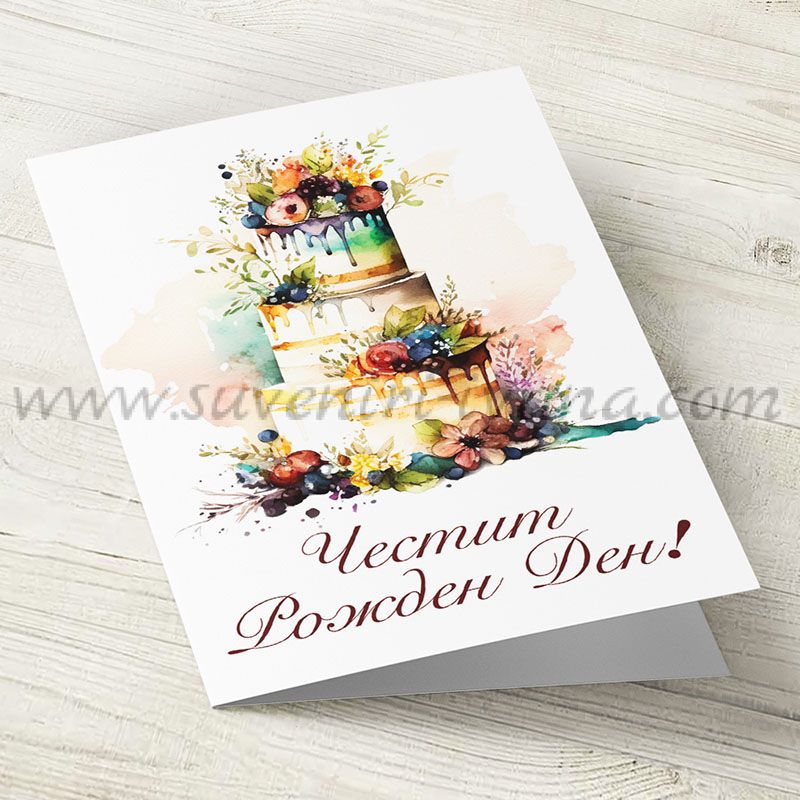 Ръчно изработена поздравителна картичка с картинка на триетажна торта с цветя и надпис 'Честит Рожден Ден'. Картичката е с размери 10,0 х 15,0 см и се предлага с плик.