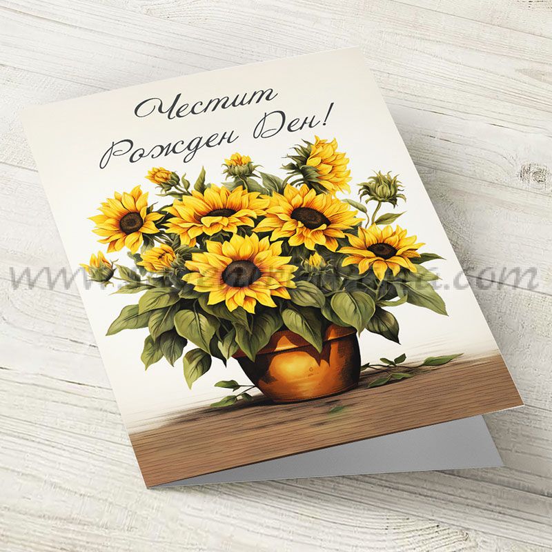Ръчно изработена поздравителна картичка с картинка на букет слънчогледи и надпис 'Честит Рожден Ден'. Картичката е с размери 10,0 х 15,0 см и се предлага с плик.