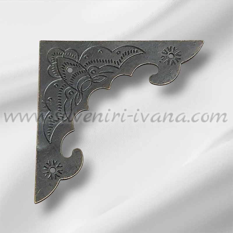 Метален ъгъл за обков и декорация на албуми, тефтери, книги и други. Цвят античен бронз. Размери 5,8 х 5,8 см.