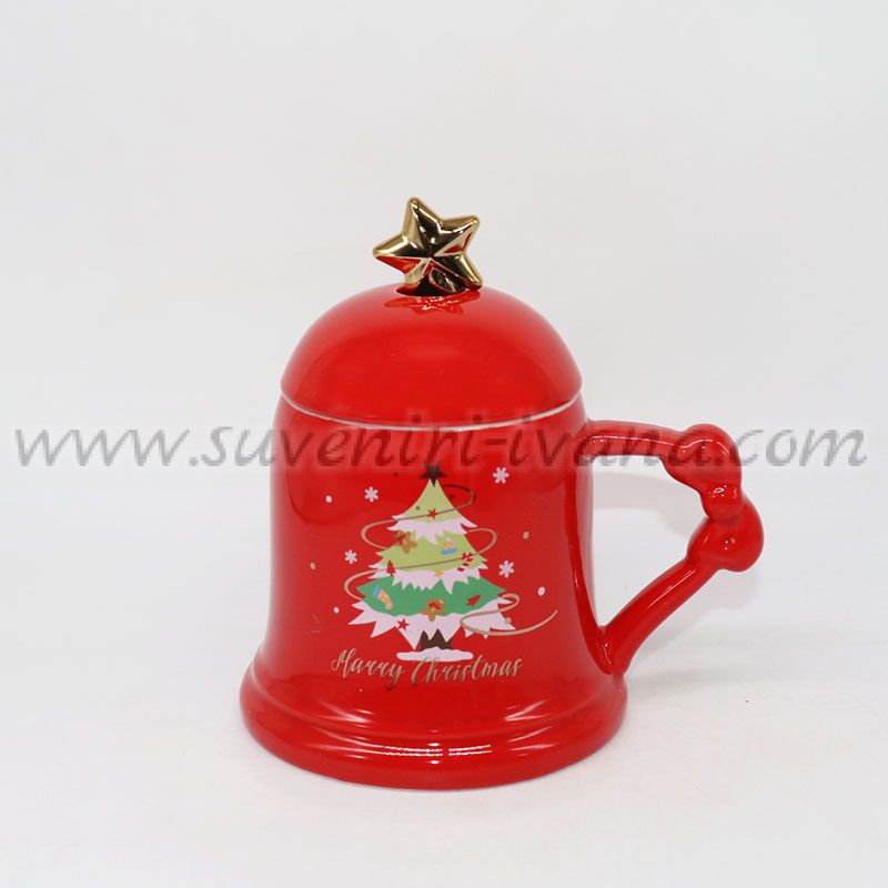Празнична червена керамична чаша във формата на камбанка с илюстрация на коледна елха и надпис Merry Christmas – перфектна за топли зимни напитки или коледен подарък.