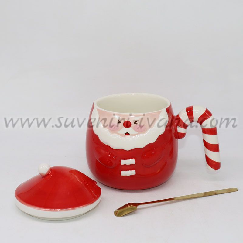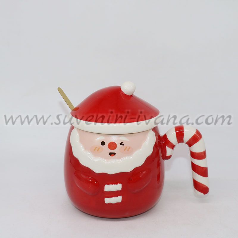 Керамична чаша във формата на Дядо Коледа с капаче, лъжичка и дръжка захарно бастунче – подходяща за чай, кафе, декорация или коледен подарък.