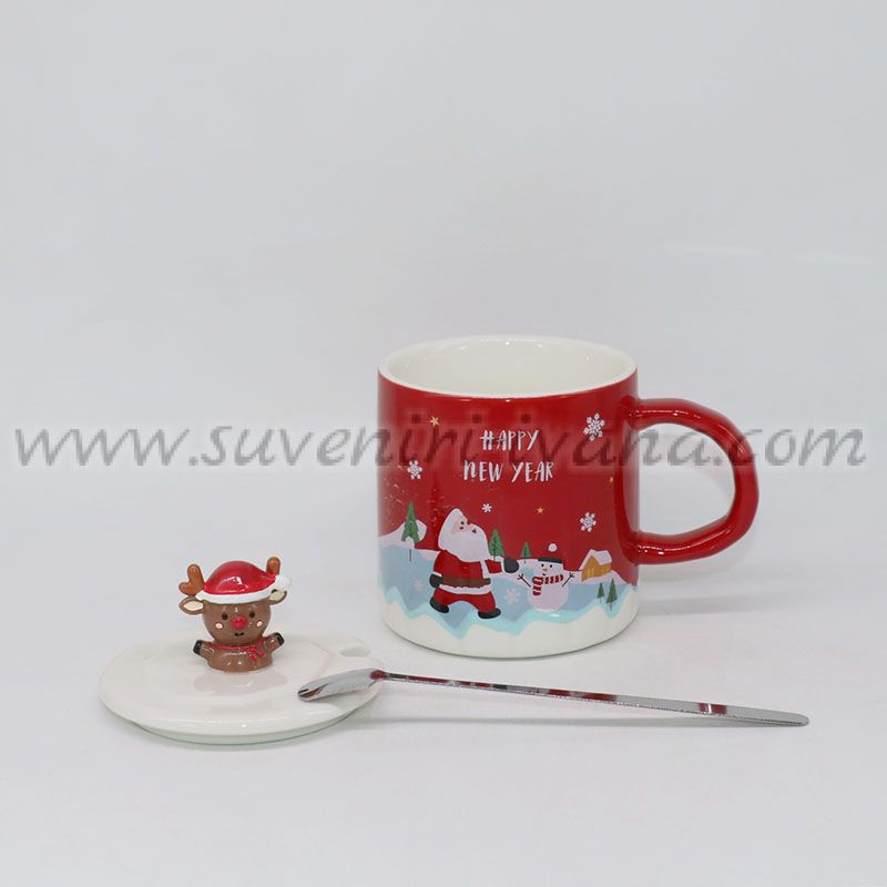 Очарователна червена керамична чаша с красив коледен дизайн и фигурка на еленче върху капачето. Перфектен подарък за Коледа за деца и възрастни, приятел или колега.