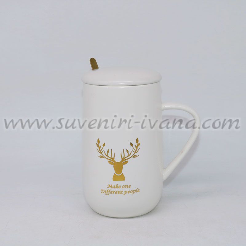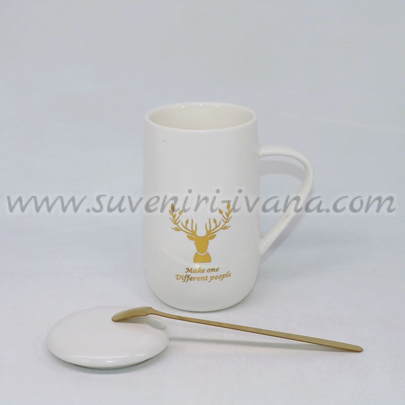 Бяла чаша с елен, капаче и лъжичка – златен принт