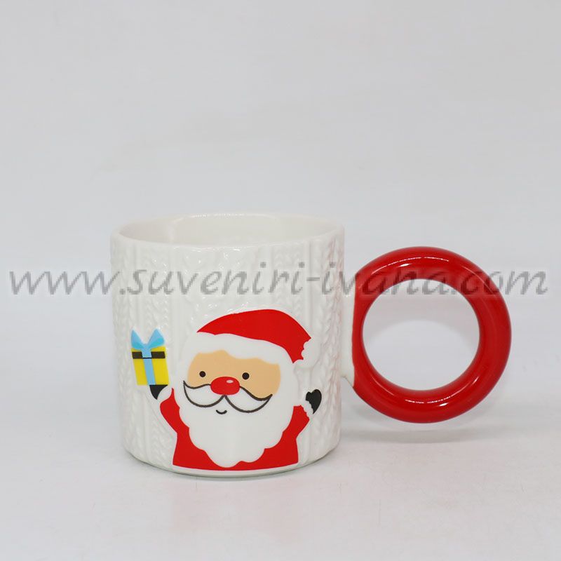 Керамична чаша с релефен коледен дизайн – Дядо Коледа с подарък. Подходяща за топли и студени напитки и празнични подаръци.