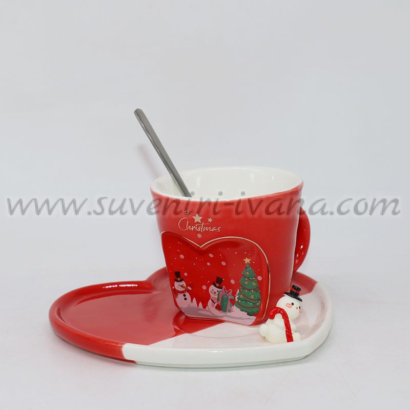Комплект коледна чаша с чинийка и лъжичка, модел три