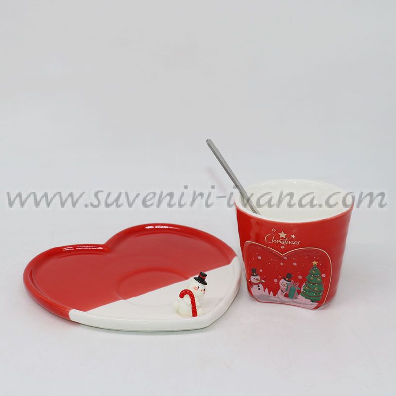 Коледен комплект – керамична чаша с надпис 'Christmas' и чинийка сърце с фигурка на снежен човек. Чудесен избор за подарък или празнично настроение у дома.