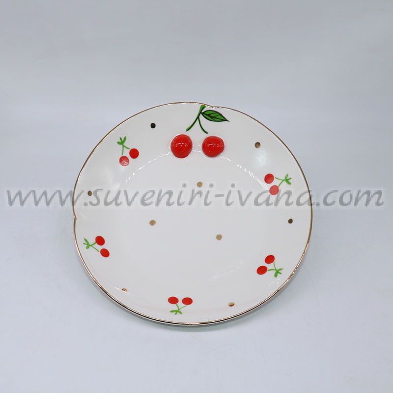Очарователна чиния с релефни черешки, деликатни точици и златен кант. Подходяща за ежедневна употреба или сервиране на десерти и плодове. Комбинирайте я с останалите артикули от същата серия за завършен сет.