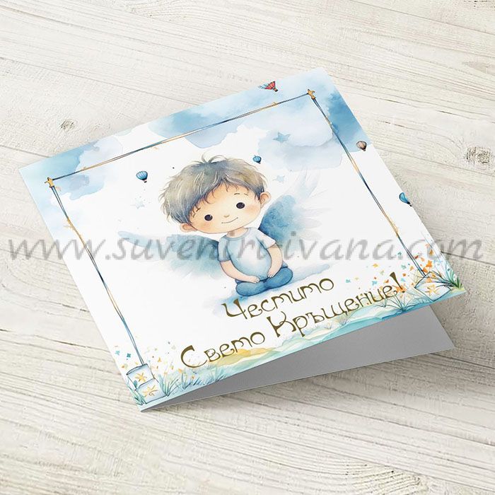 Ръчно изработена поздравителна картичка за кръщене на момченце с надпис 'Честито свето кръщение'. Картичката е с размери 10,0 х 9,6 см.