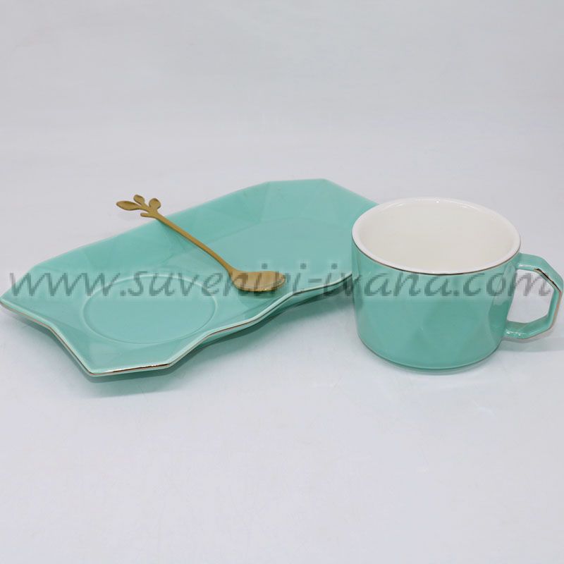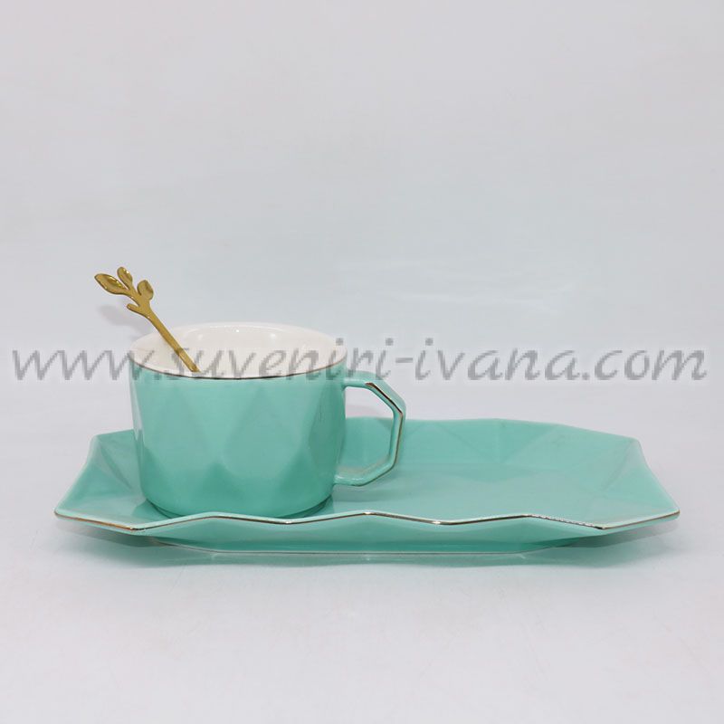 Елегантен комплект за кафе или чай, включващ керамична чаша, чинийка и златиста лъжичка. Изискан дизайн в тюркоазен цвят с геометрична форма и златен кант.