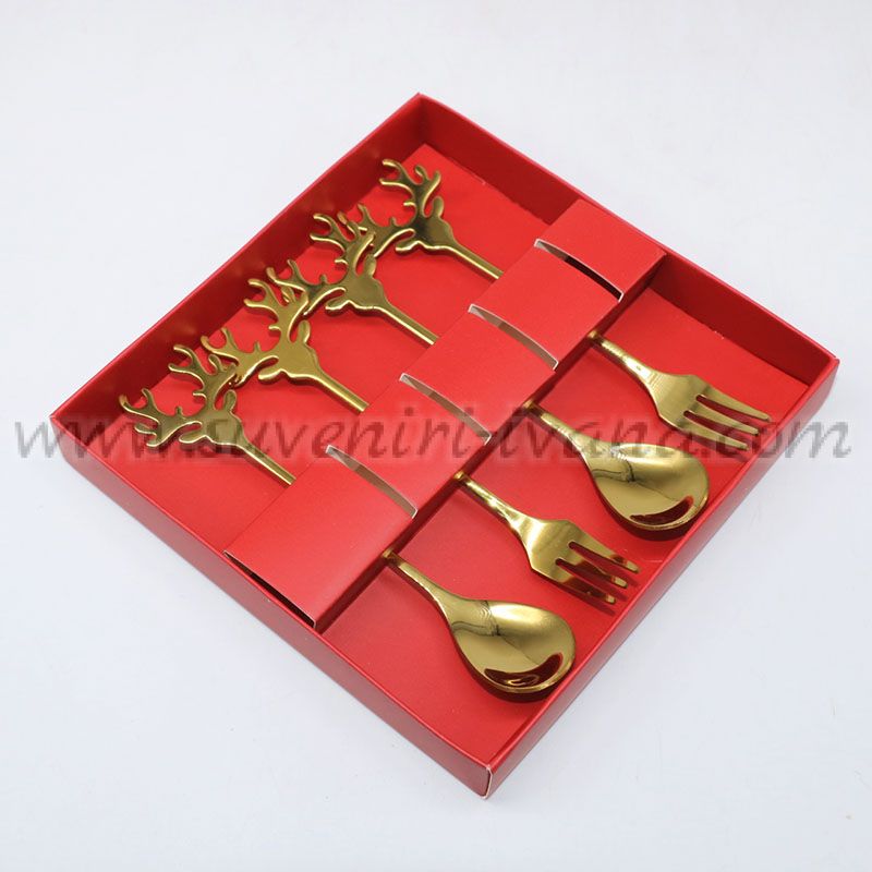 Този празничен комплект включва четири златисти прибора – две лъжички и две вилички, с уникален дизайн на дръжките във формата на еленови рога. Те придават на всяка маса изтънчен и коледен вид.