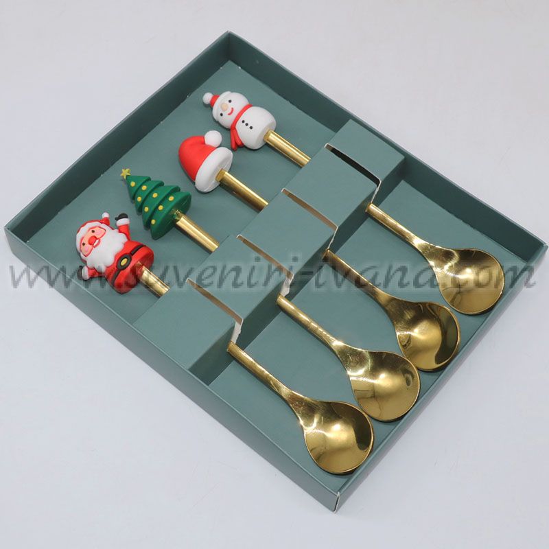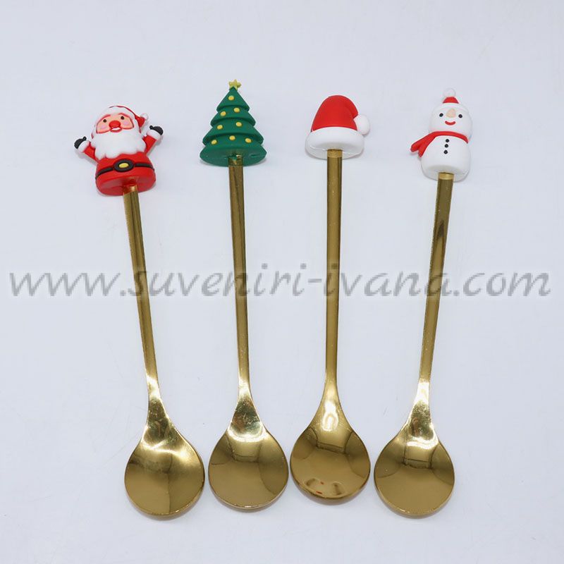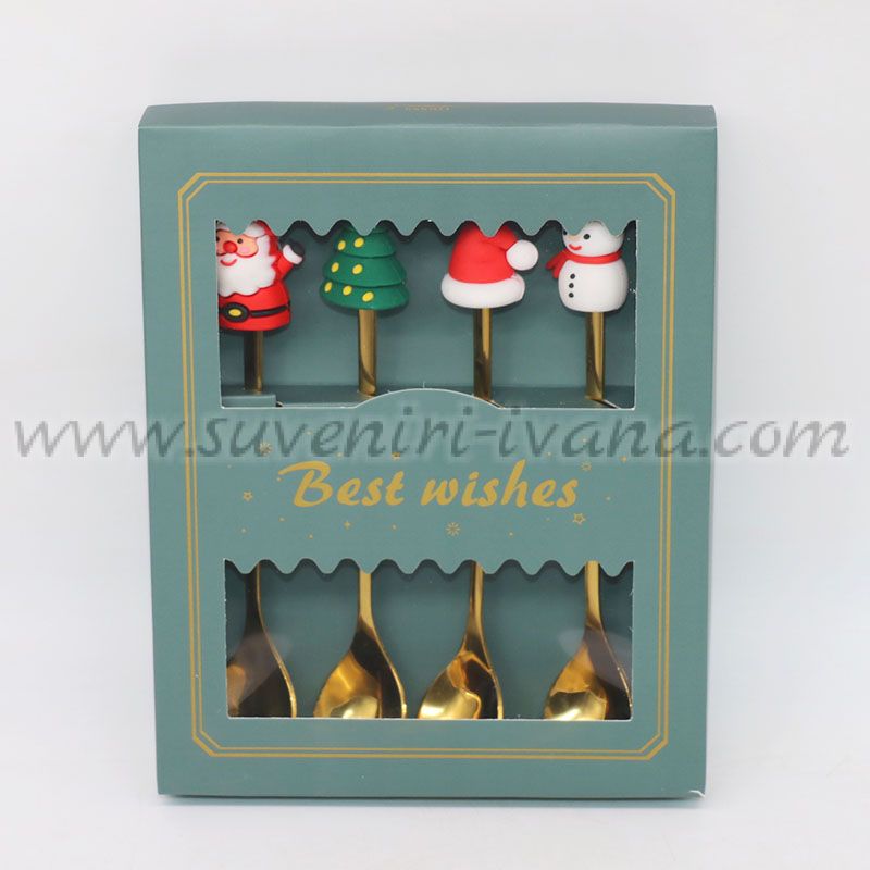 Комплектът включва четири златисти лъжички, украсени със силиконови фигурки – Дядо Коледа, коледна елха, шапка и снежен човек.