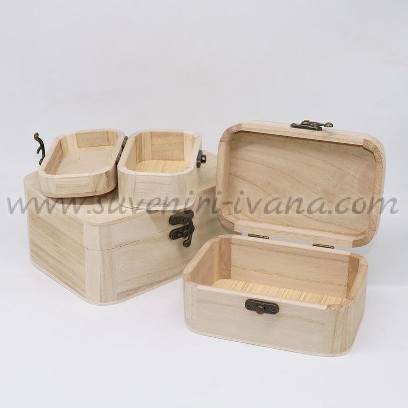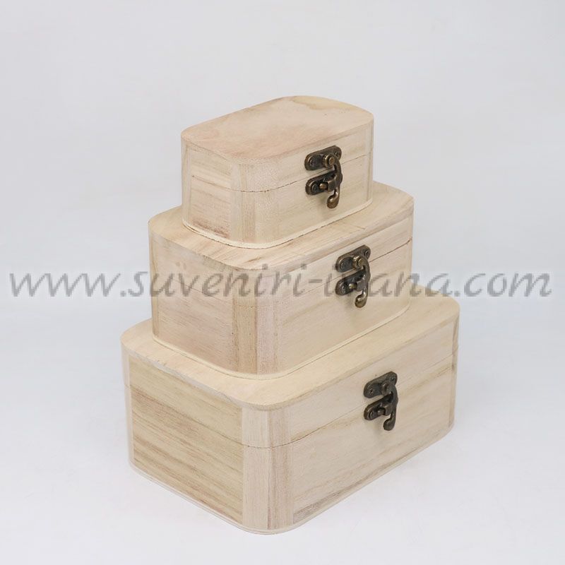 Този комплект включва три дървени кутии, изработени от натурално дърво с метални закопчалки в ретро стил. Кутиите са идеална основа за различни творчески проекти – декупаж, рисуване, пирография, изписване с акрилни бои и други декоративни техники.