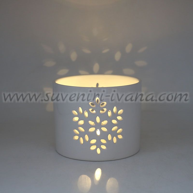 Керамичен свещник с декоративни изрязани мотиви, които създават красив светлинен ефект при запалена чаена или друга подходяща свещ.