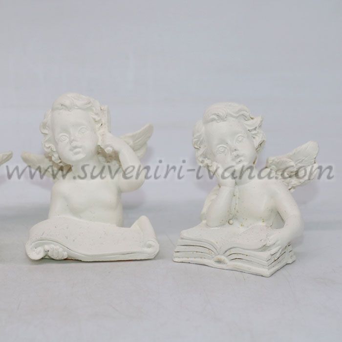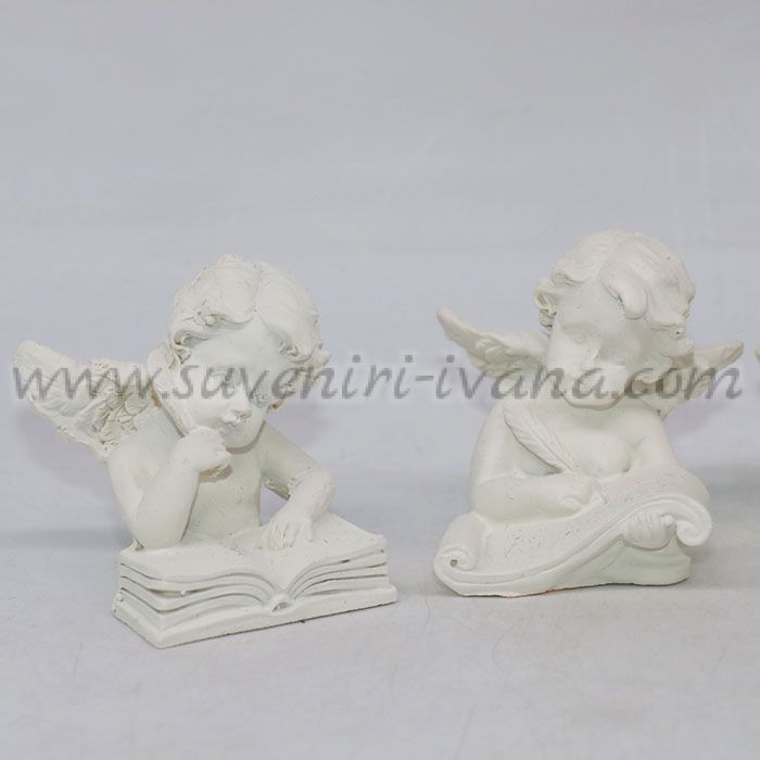 Фигурките са изработени от полирезин и са в нежно бял цвят, с изчистена и елегантна визия. Идеални са за празнична украса, тематични диорами, витрини, рафтове, колекции или като малък, фин подарък за ценители на ангелски мотиви. Приблизителни размери: 4х5х4,5 см.