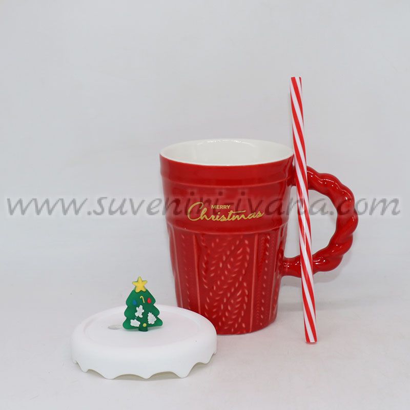Празнична керамична чаша в червен цвят с релефен дизайн и надпис 'Merry Christmas', дръжка тип бонбонена пръчка, силиконов капак с коледна елха и сламка.