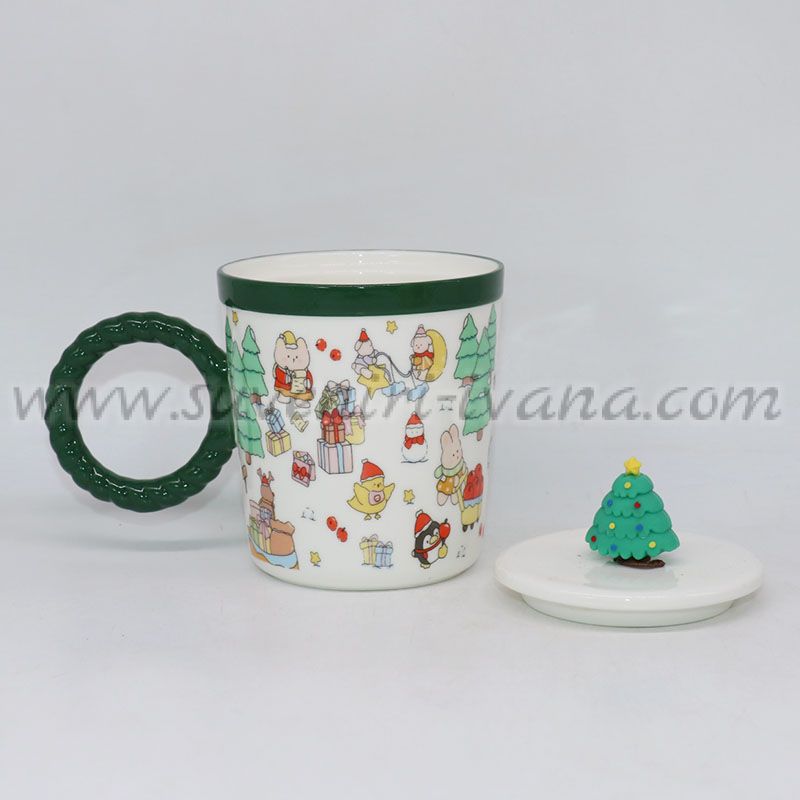 Празнична керамична чаша с коледни мотиви, капаче с елхичка и оригинална зелена дръжка във формата на венец.