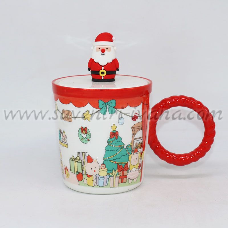 Празнична керамична чаша с коледни мотиви, капаче с дядо Коледа и оригинална червена дръжка във формата на венец.