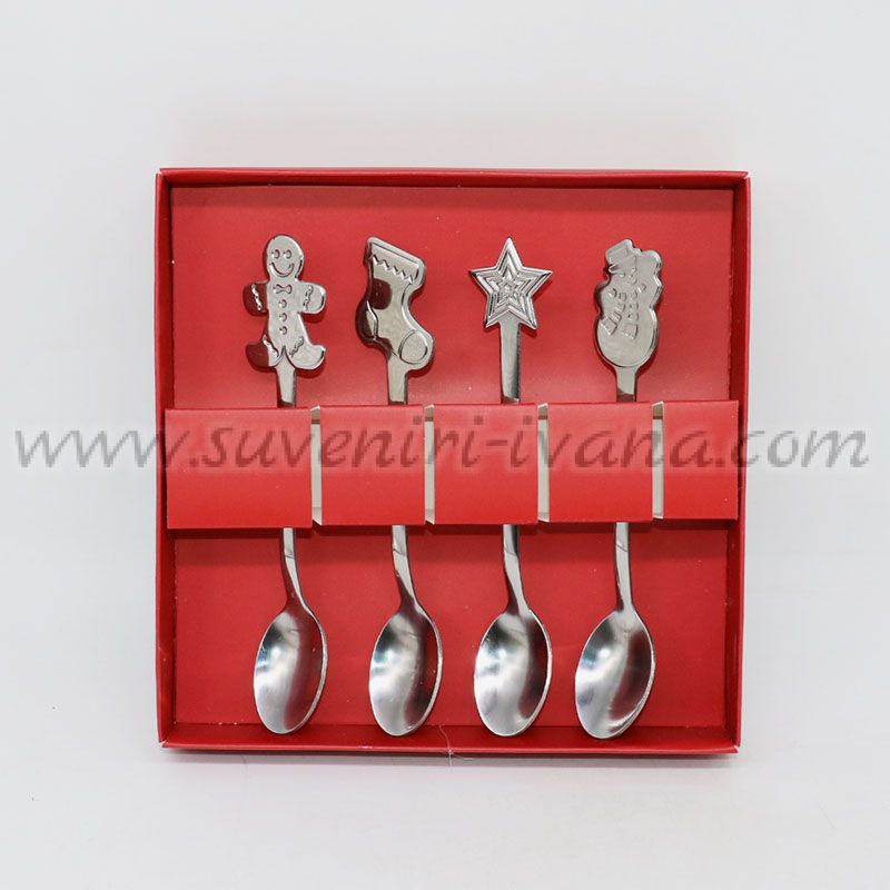 Елегантен комплект от четири сребристи лъжички с коледни декорации – джинджифилово човече, ботушче, звезда и снежен човек. Идеални за кафе, десерт или подарък с празнично настроение.