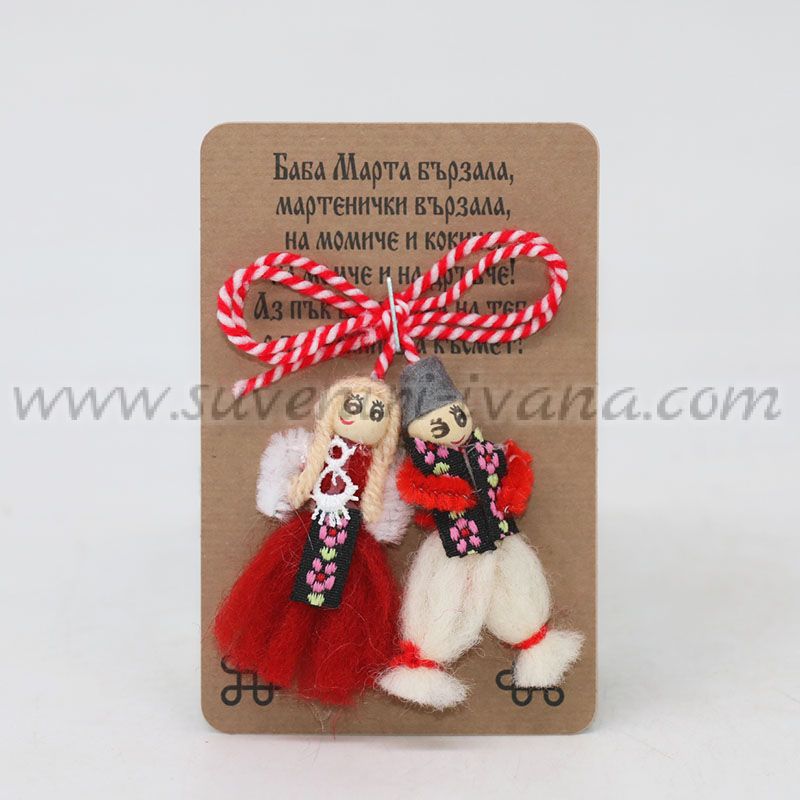 Мартеницата с фигурки на Пижо и Пенда е класически символ на българската традиция за Баба Марта. Комплектът включва две миниатюрни вълнени фигурки – момиче и момче, изработени с внимание към детайла и облечени във фолклорен стил. Фигурките са закрепени към червено-бяла връв и са поставени върху тематично картонче с пожелание, което ги прави подходящи и готови за подаряване.