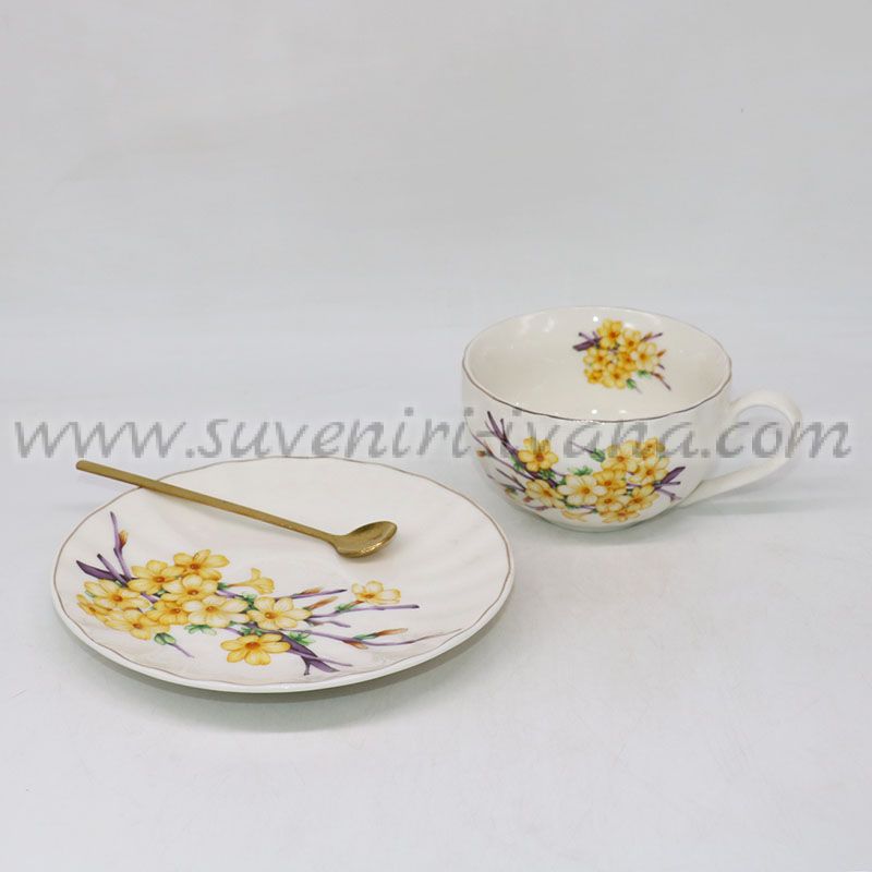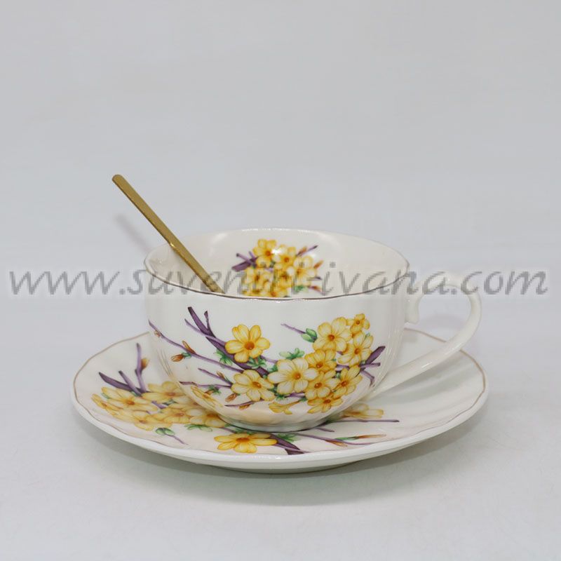 Порцеланова чаша с чинийка и златиста лъжичка – жълти цветя