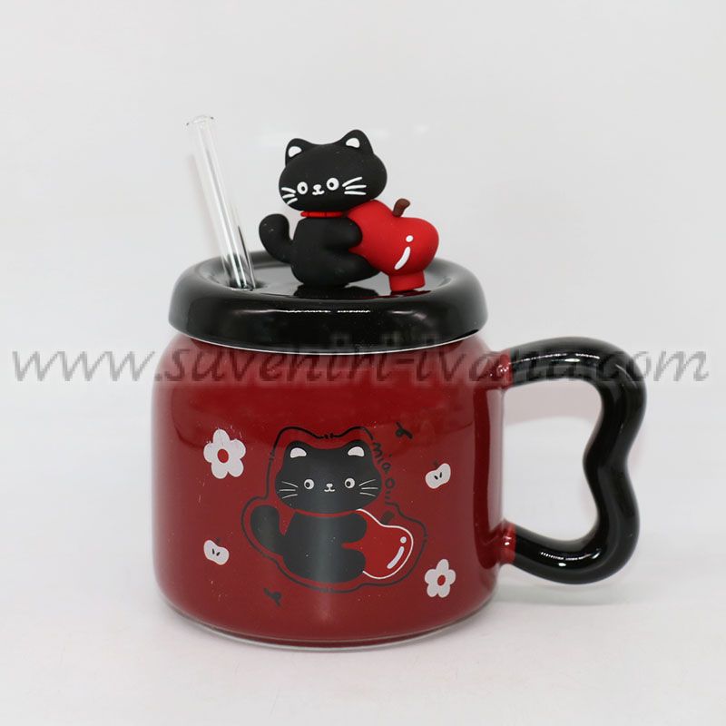 Червена керамична чаша с коте, черна дръжка във формата на сърце, капак с фигурка черно коте и стъклена сламка. Вместимост около 400 мл.