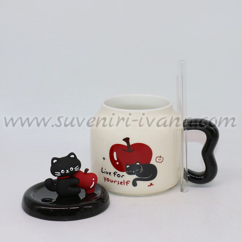 Бяла керамична чаша с коте, черна дръжка във формата на сърце, капак с фигурка черно коте и стъклена сламка. Вместимост около 400 мл.
