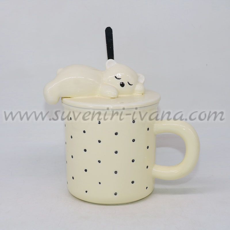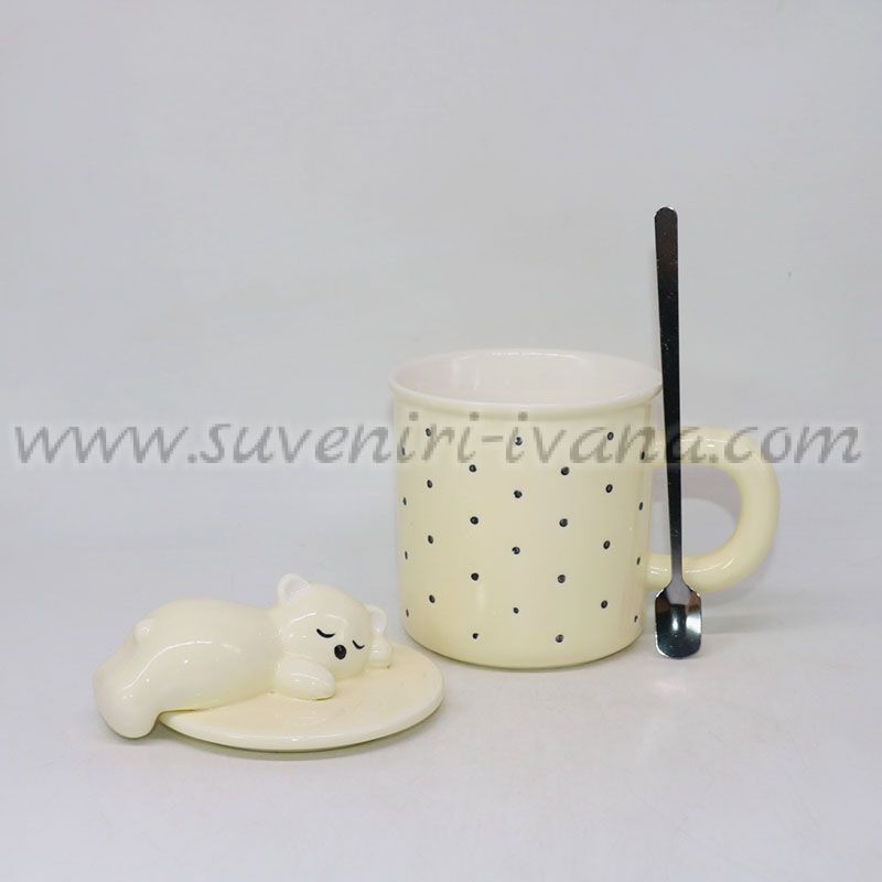 Сладка керамична чаша в бледожълт цвят с точки, капак с фигурка на спящо мече и метална лъжичка. Вместимост приблизително 400 мл.