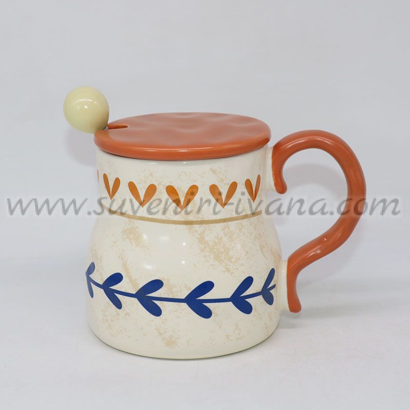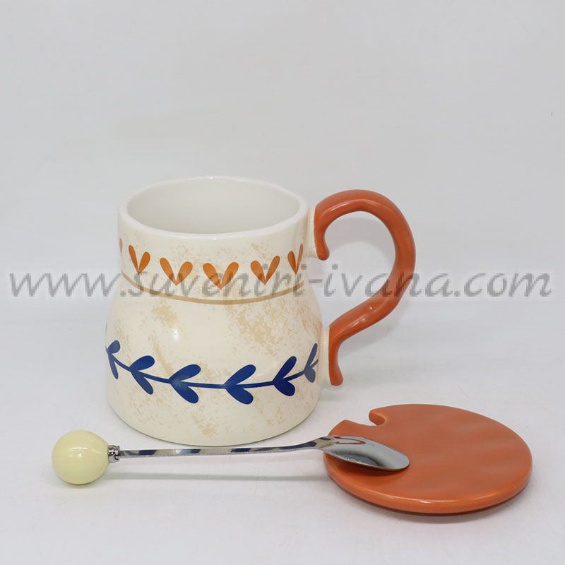 Декоративна керамична чаша с капаче и метална лъжичка, с орнаменти и сърца. Подходяща за кафе, чай и подарък. Вместимост приблизително 400 мл.