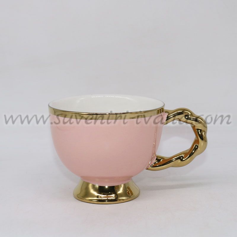 Луксозна керамична чаша в нежен розов цвят със златиста основа, златист ръб и ефектна дръжка в златен цвят. Контрастът между розовото и златното създава изискано и впечатляващо излъчване.