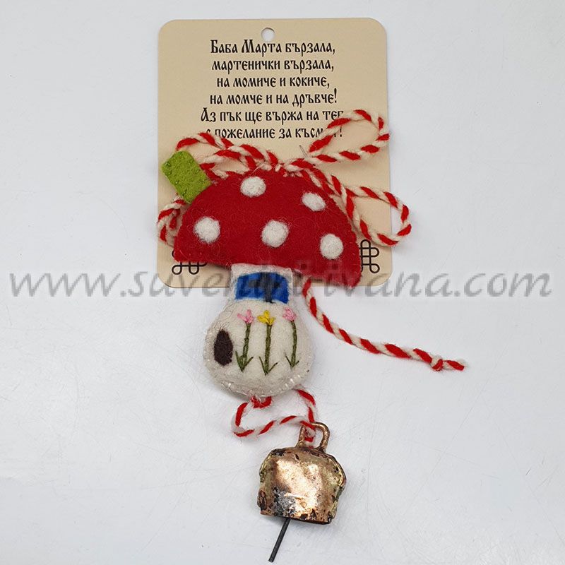 Ръчно изработена мартеница гъбка от филц с метален чан – подходяща за закачане като пролетна мартенска декорация. Предлага се с картонче с пожелание за здраве и късмет.