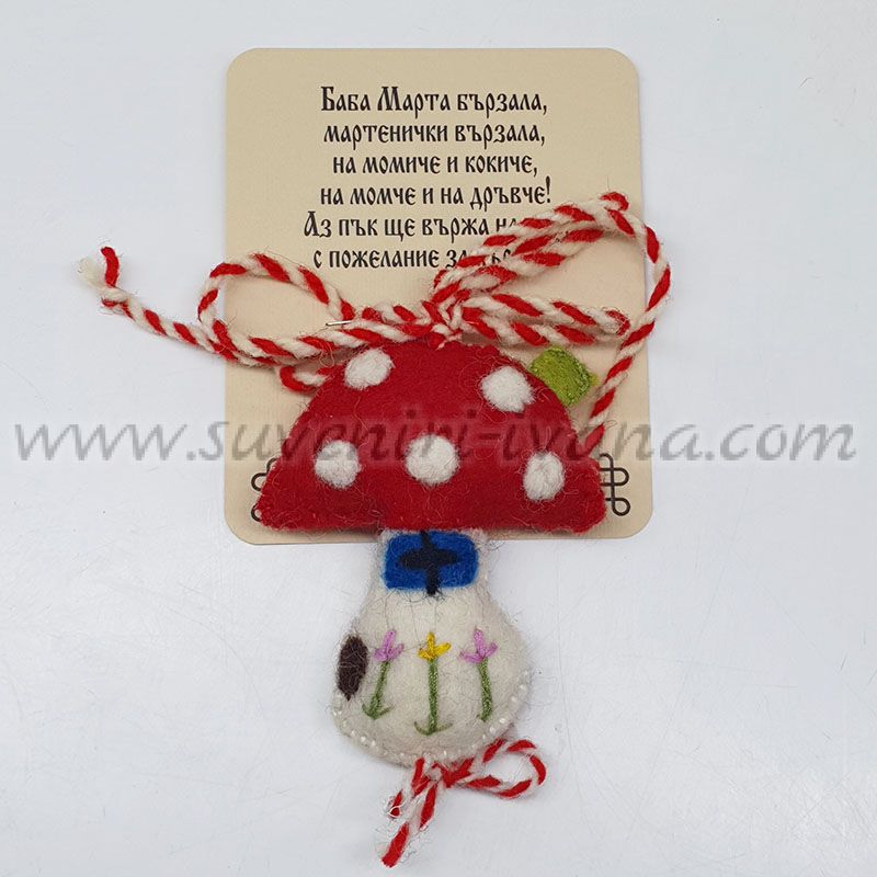 Очарователна мартеница във формата на червена гъбка с бели точки, изработена от филц и декорирана с цветни бродирани детайли. Съчетава традиционния бяло-червен шнур с игрив и пролетен дизайн.