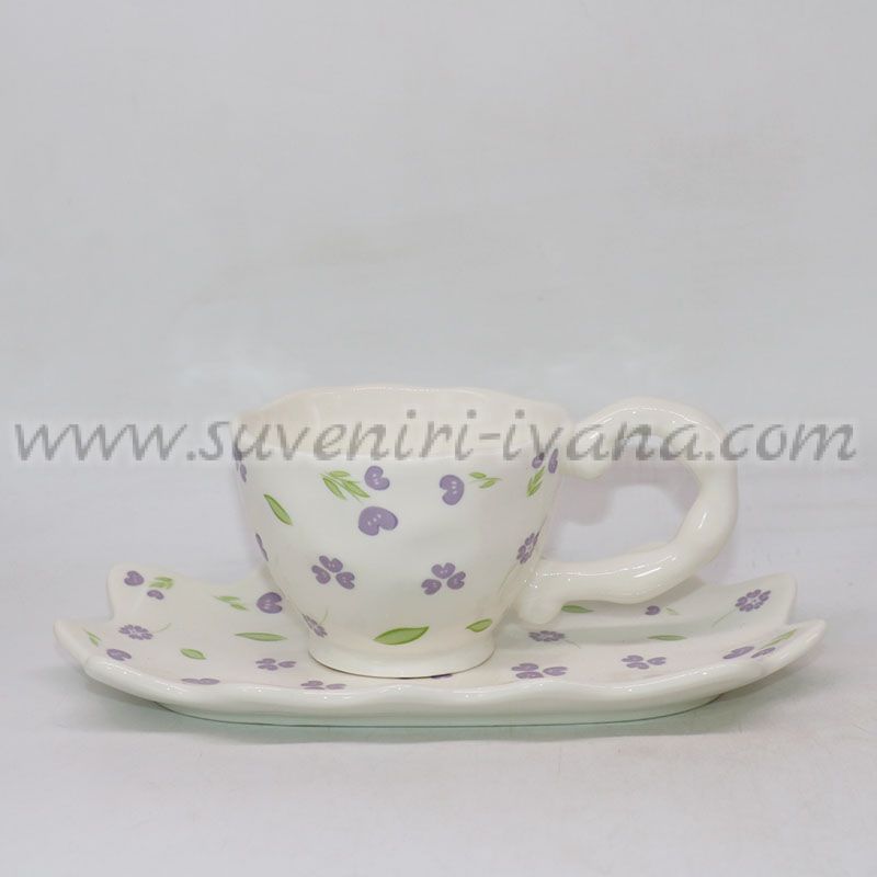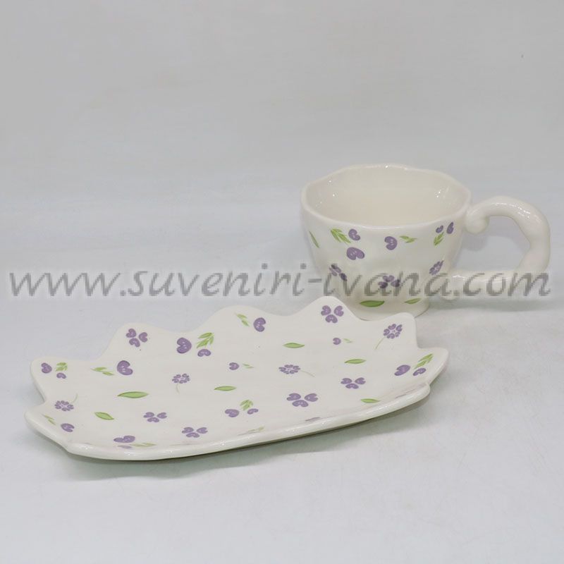 Този керамичен комплект включва стилна чашка и чинийка с хармоничен флорален мотив в лилави и зелени нюанси. Формата на чинийката придава оригиналност и естетика, а деликатният дизайн носи усещане за лекота и пролетен уют.