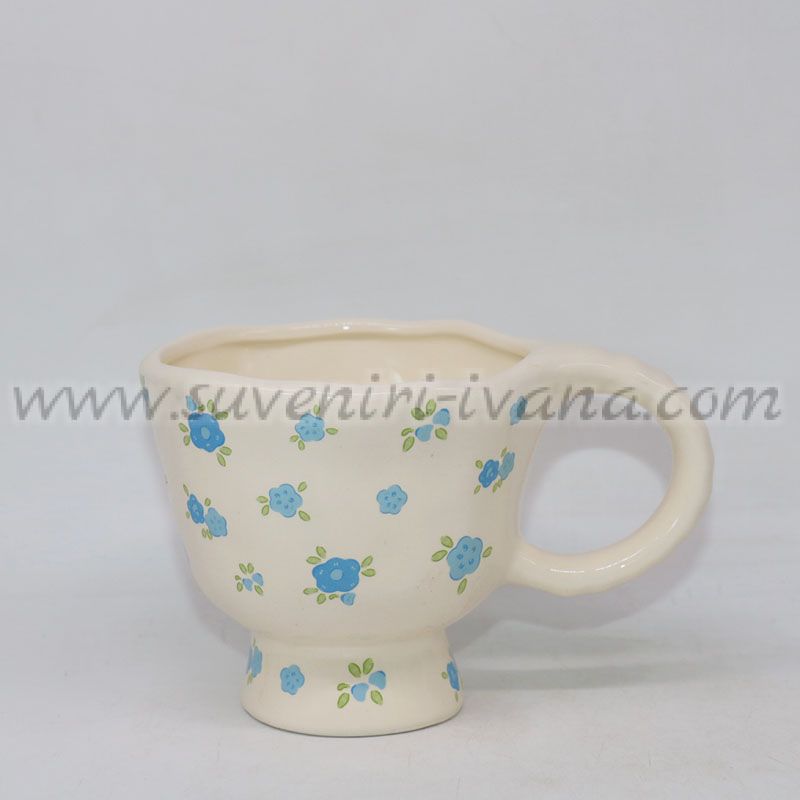 Нежна керамична чаша в светъл кремав тон със сини флорални мотиви и елегантна основа - идеална за кафе, чай, капучино и други напитки. Вместимост около 300 мл.