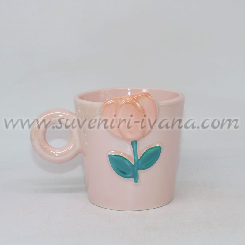 Керамична чаша в нежен розов цвят с красив пролетен дизайн лале. Подходяща за чай, мляко, сок или вода. Вместимост около 350 мл.