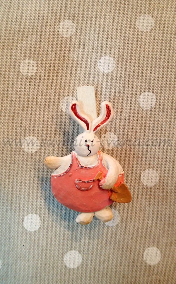 Зайчето е изработено от полимерна смола, а щипката е дървена. Размери на зайчето 60 х 40 мм, размери на щипката 75 х 10 мм.